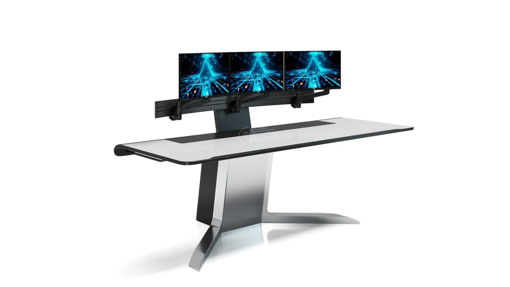 桌面采用平滑的弧形过渡,搭配极具科技感的支撑底座,整体视觉上简洁且富有未来感,符合现代指挥中心、数据中心的审美